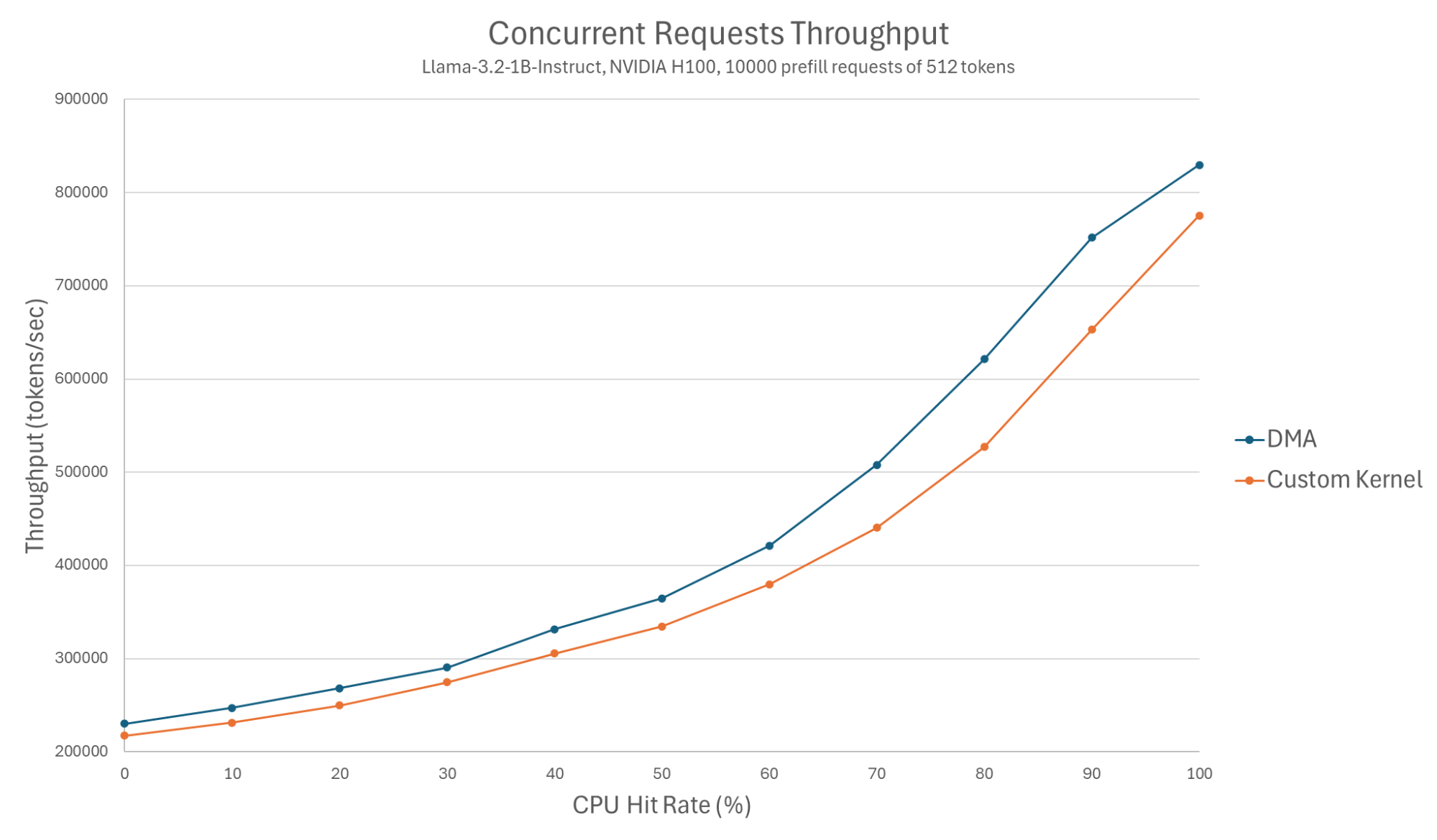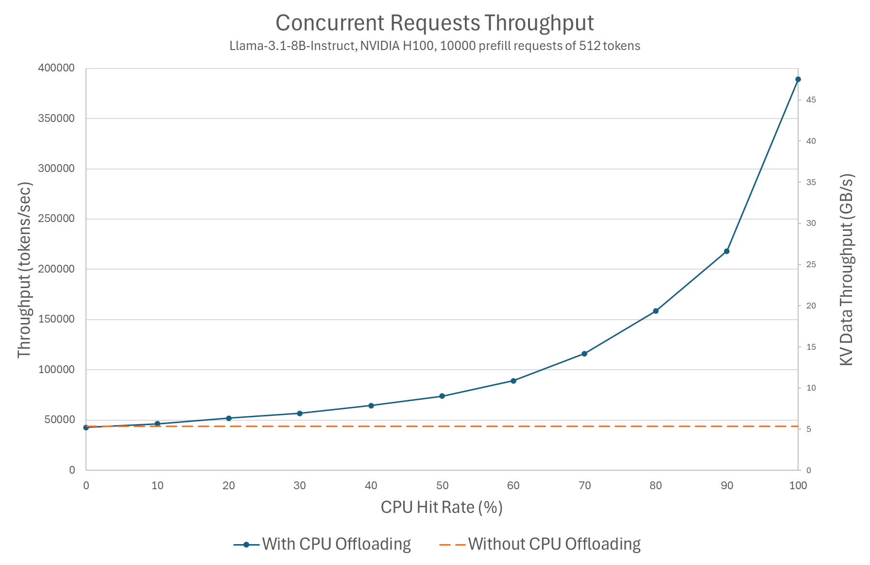 Next, we benchmark the effect of using CPU offloading on the overall throughput when handling multiple concurrent requests. This essentially submits a batch of 10,000 unique requests (each of 512 tokens), and measures the throughput achieved for various levels of hits in the CPU cache.