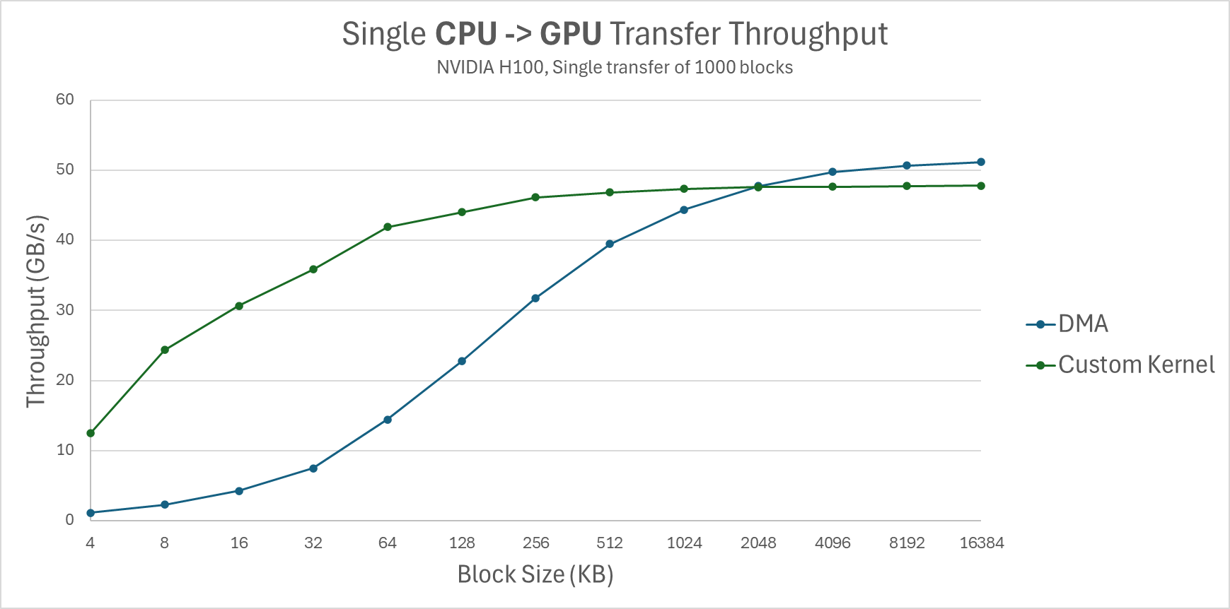 Figure 4: Single CPU -> GPU transfer throughput (NVIDIA H100, Single transfer of 1000 blocks).